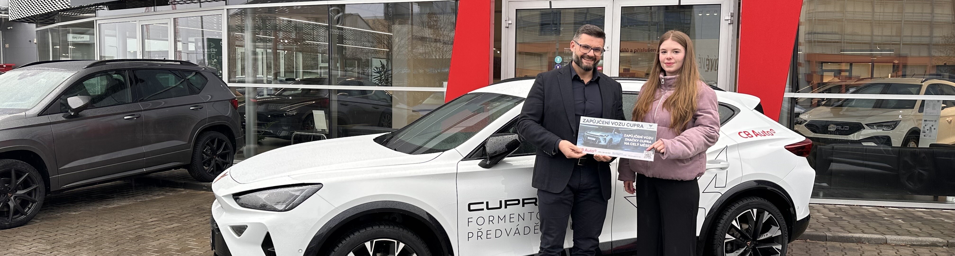 Poukaz na zapůjčení vozu si u nás v CB Auto převzala z rukou Františka Fišera, předsedy představenstva. Čeká ji měsíc plný dynamiky, moderního designu a jedinečných jízdních zážitků, které jsou pro značku CUPRA typické.